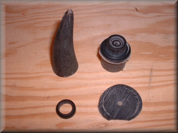 (25 May) Here are some parts of the solid top part of the horn. I cut out a chunk (upper right) to turn down a ring (lower left) for the top of the chanter. In the section at the lower right, you can see there's two c-shaped voids - there were two large "bubbles" inside the wall of the horn, and extending up into the otherwise solid top part. Fortunately all the parts i needed were in between these bubbles, so they were never an issue. |