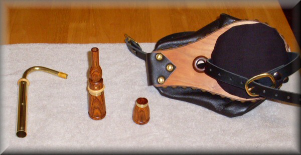 The rest of the parts for the practice set (all except the chanter so far), from left to right: - Chanter top. We decided on the out-the-top "swan" neck arrangement. - Blowpipe in its stock. - Chanter stock. - Bellows. The inlet valve is made of cocobolo to match the rest of the set, and i've just finished making up the belts and cushions so it's ready to go.