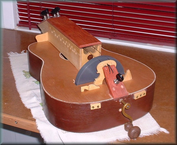 (12 Feb) Ok, so there was one more thing to add: a brace to reinforce the wheel slot, right in front of the bridges. Without the brace there, the soundboard tends to cave in under the tension of the strings. With the brace installed, the bridge stays stable while tightening the strings up, making it much easier to get the string action correct over the wheel. And that's it! Just about exactly 6 months. Of course, it'll never really compare to a professionally made instrument, but i think it sounds great! (especially for a first try. :-) |